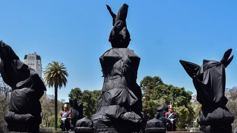 Alrededor de Carrió, de su admirador y de su detractor se lleva a cabo una convocatoria artística, aunque la política -como es su costumbre- asome. Es que el Monumento al General San Martín y a los Ejércitos de la Independencia está completamente cubierto por telas negras: la artista cordobesa Dolores de Argentina encabezó la “invisibilización” del conjunto escultórico el último viernes.