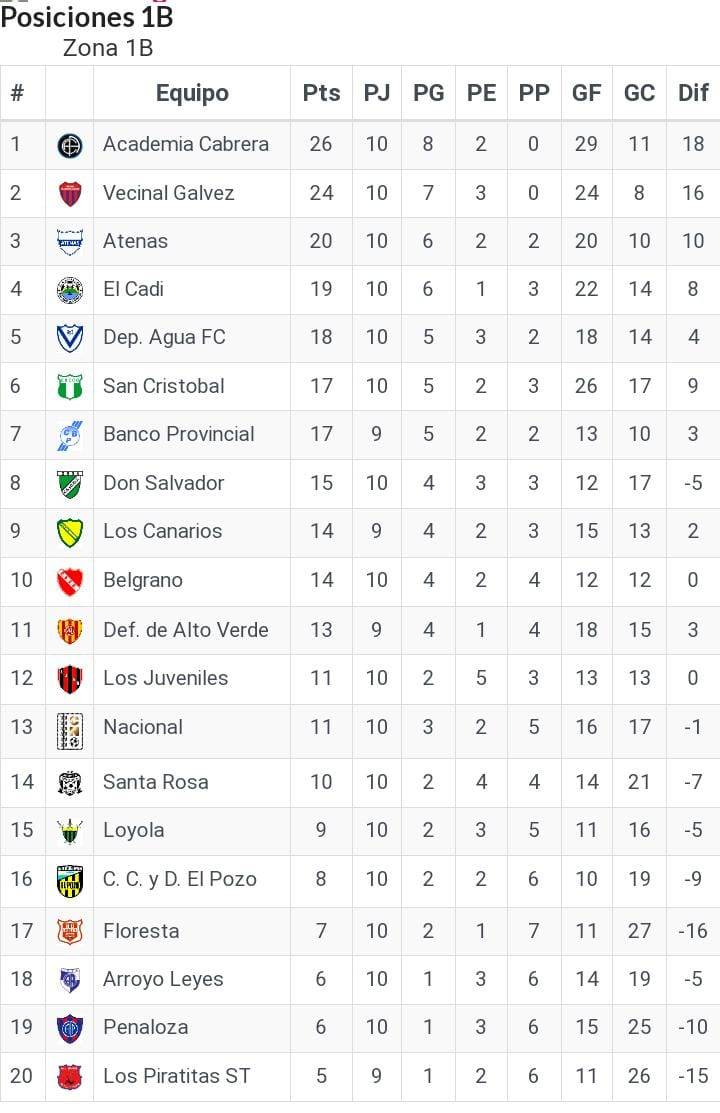 El centro cultural deportivo el Pozo le ganó como local en cancha de banco 1/0 a los Canarios con gol de Axel Rodríguez a los 5 min del segundo tiempo por la fecha 19 del torneo de primera B de liga santafesina torneo Jorge García .El puntero es la Academia Cabrera que goleó 6)2 a Floresta y el escolta es Vecinal Gálvez de sauce Viejo que le ganó 5 a 1 a San Cristóbal.