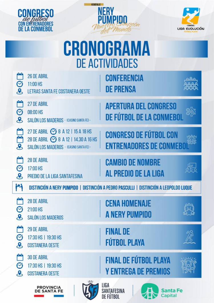 Debido al Congreso CONMEBOL que organizará la Liga Santafesina en Santa Fe, sumado al cambio de nombre del predio a Nery Alberto Pumpido y las finales de la Liga Evolución de fútbol playa, los campeonatos sufrirán postergaciones de sus respectivas fechas. Por otra parte pasamos el cronograma del Congreso.
