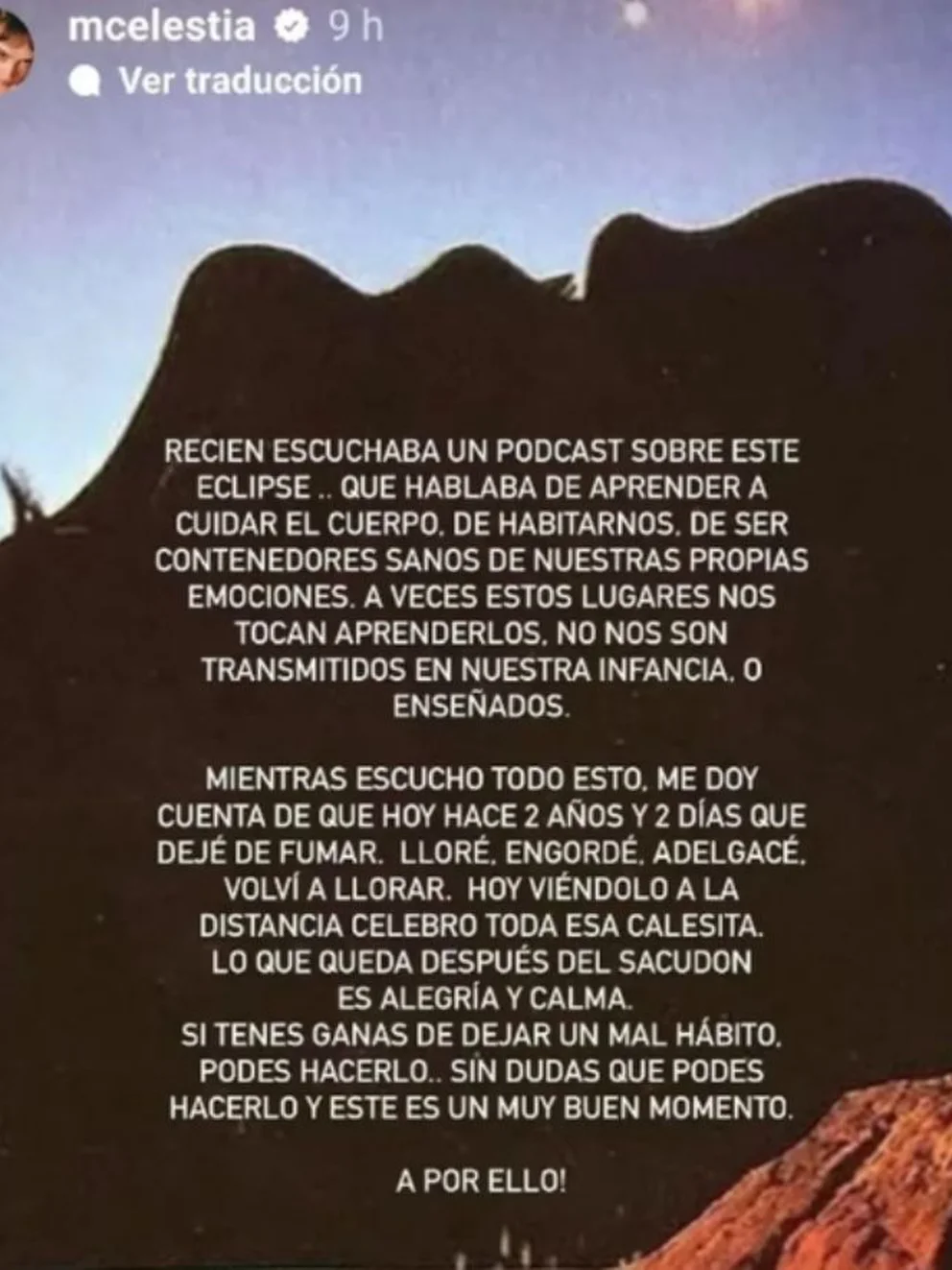 “Recién escuchaba un podcast sobre este eclipse, que hablaba de aprender a cuidar el cuerpo, de habitarnos, de ser contenedores sanos de nuestras propias emociones”, comenzó contando Celeste en una publicación que subió a sus historias de Instagram. “A veces estos lugares nos tocan aprenderlos, no nos son transmitidos en nuestra infancia o enseñados”, prosiguió a continuación.
